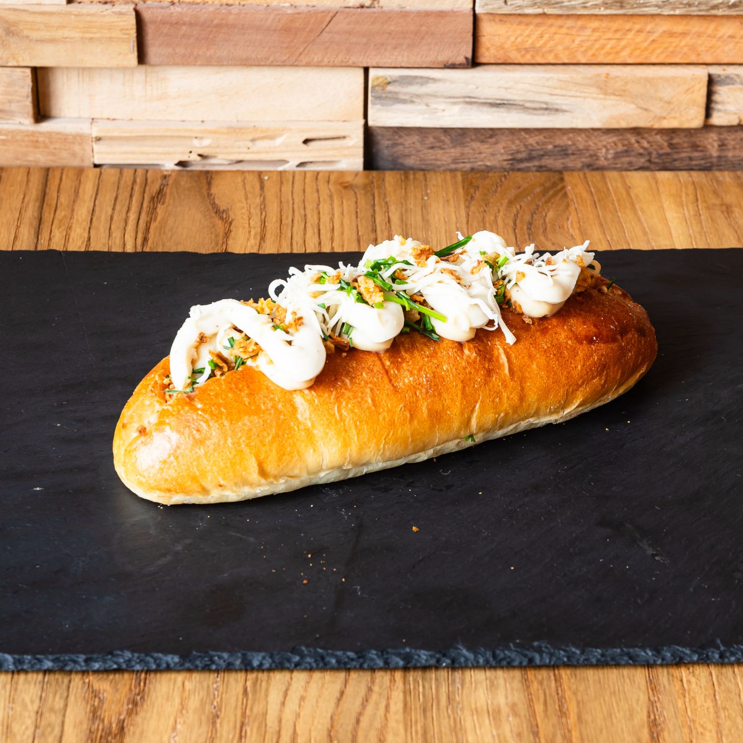 Pain viennois nature, béchamel moutarde, grande saucisse de Frankfort, cheddar râpé, ciboulette