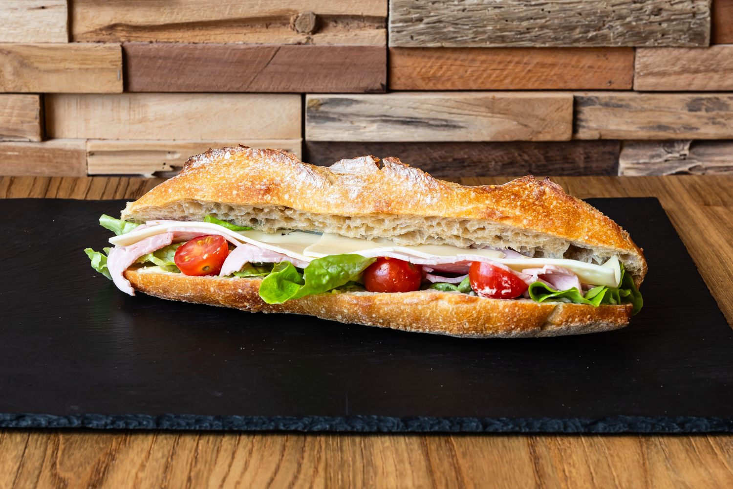 Notre sandwich est préparé dans notre cuisine et notre baguette dans notre fournil.