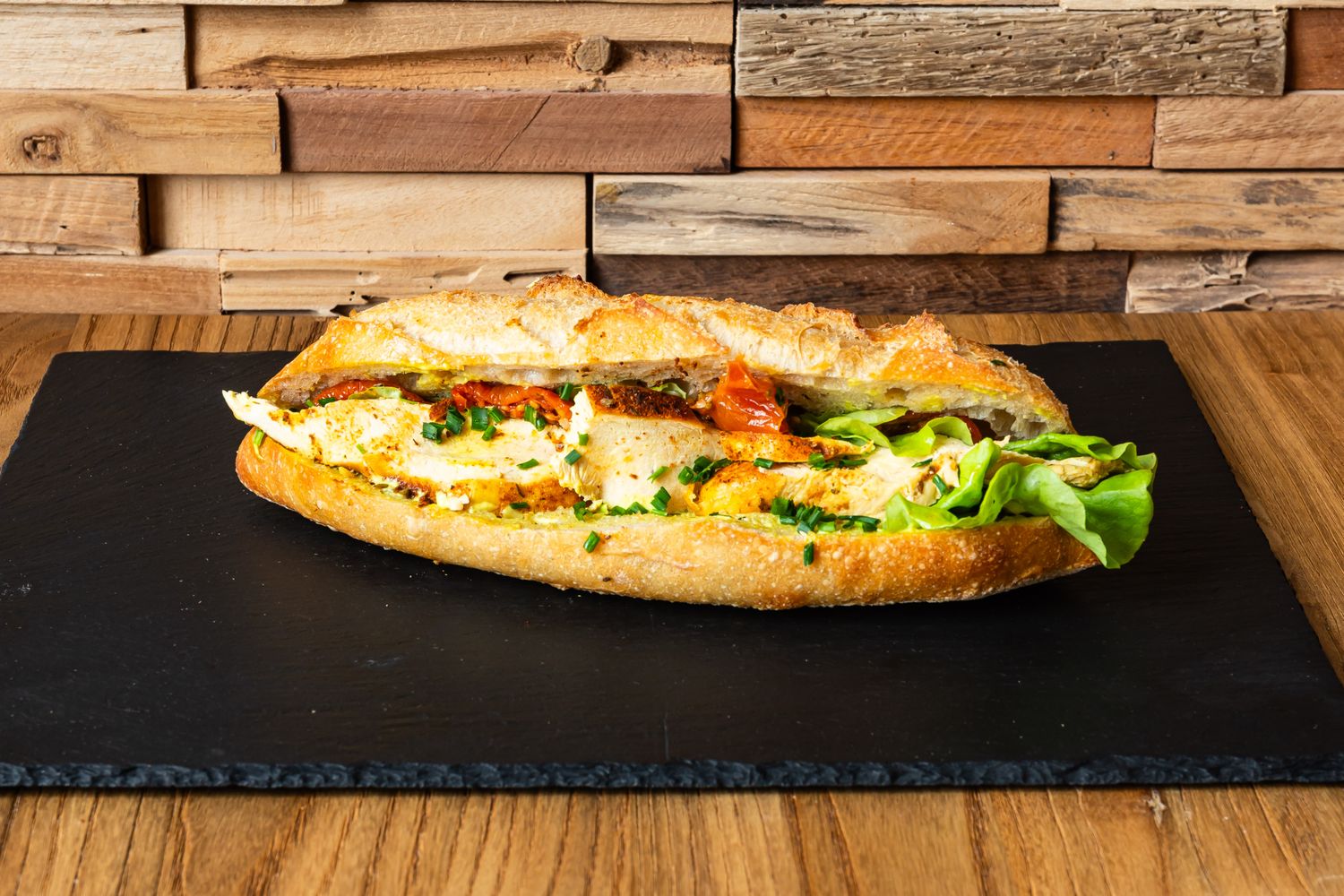 • Notre sandwich est préparé dans notre cuisine et notre baguette dans notre fournil.